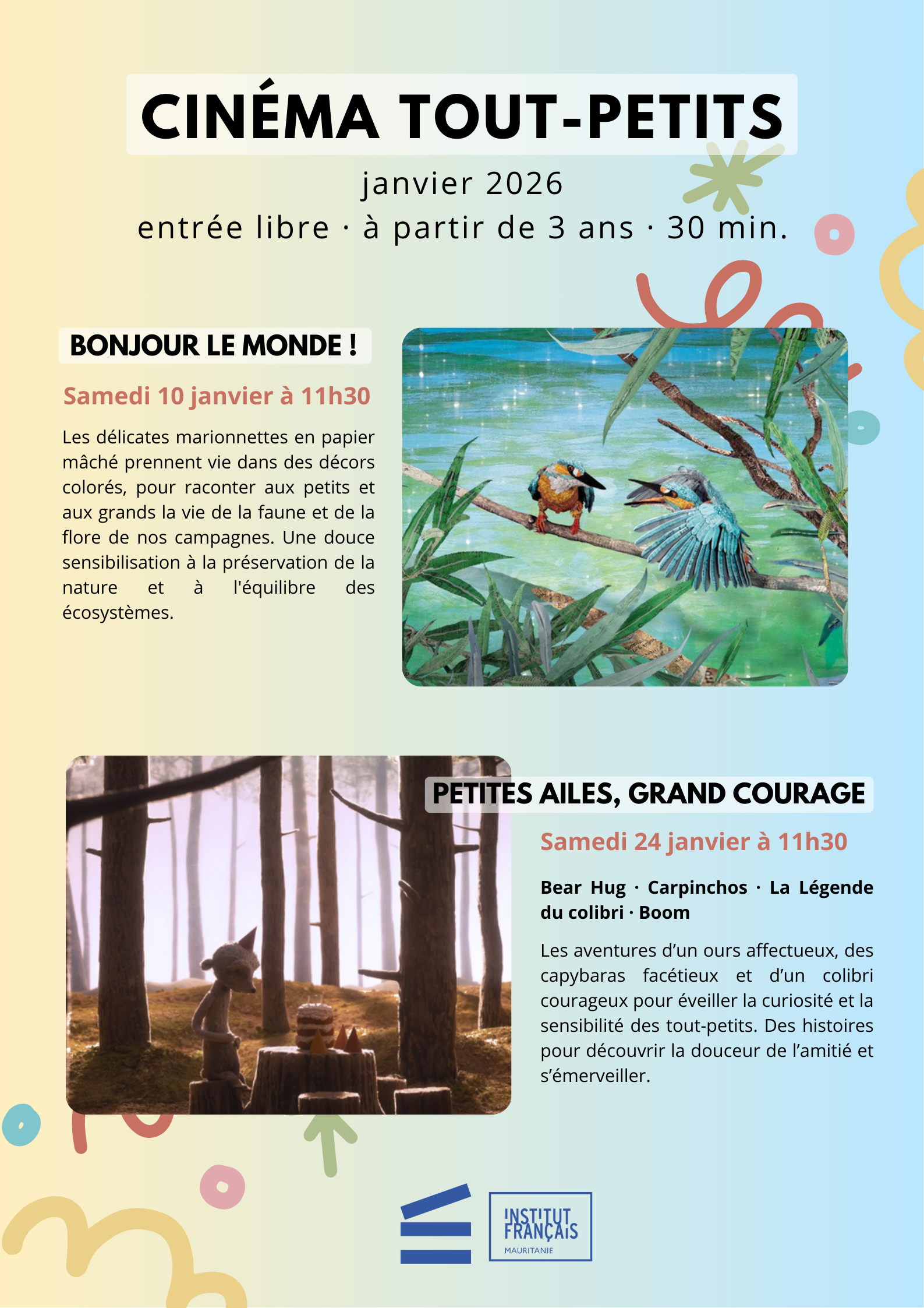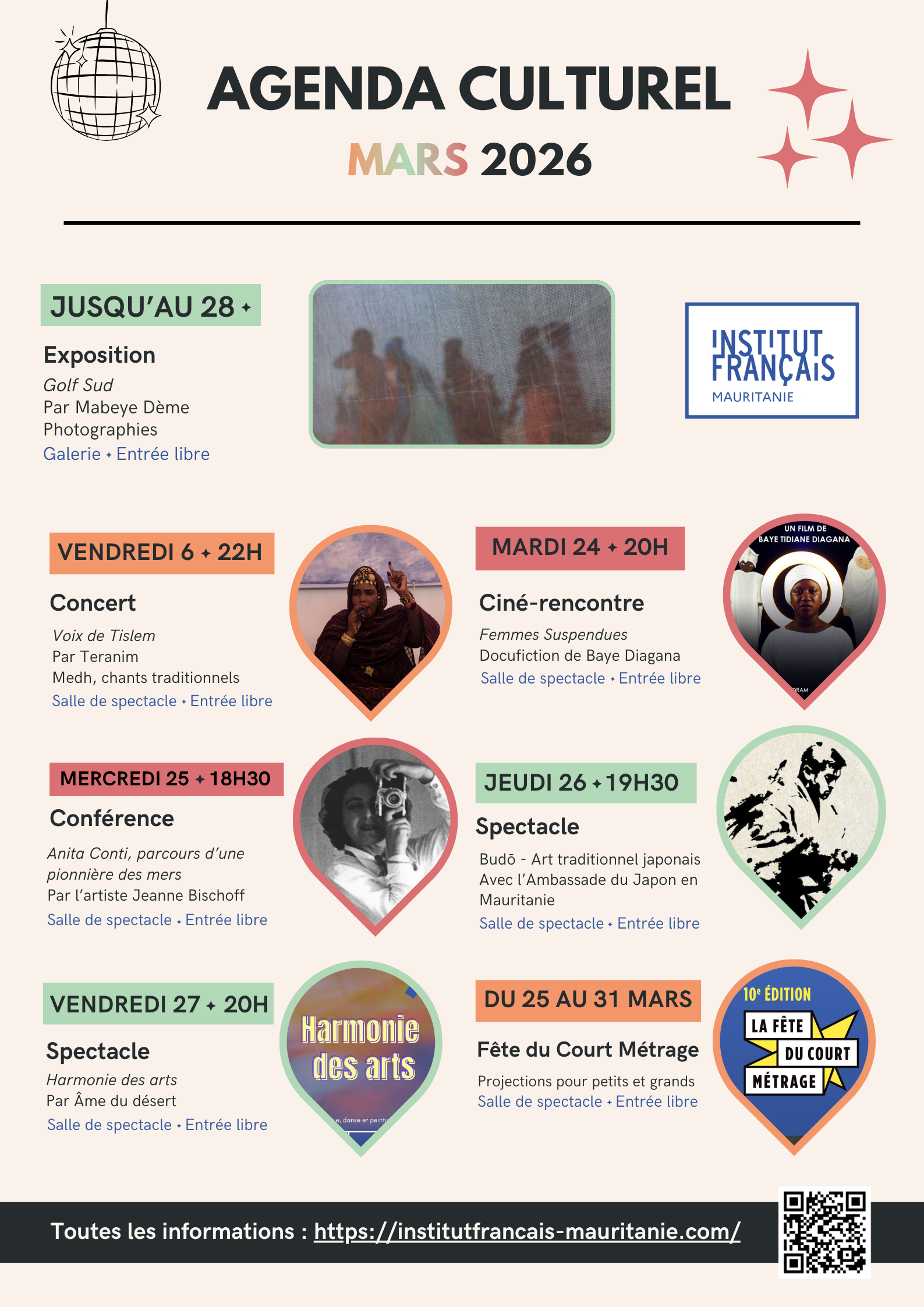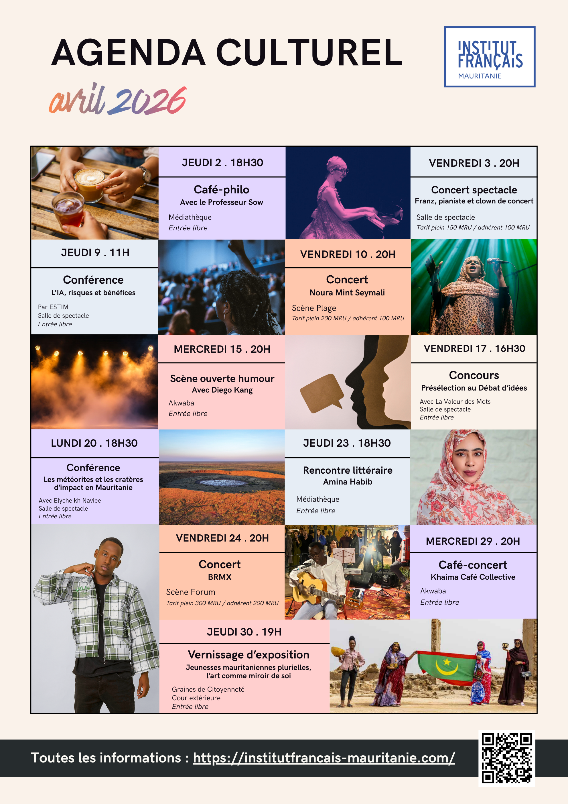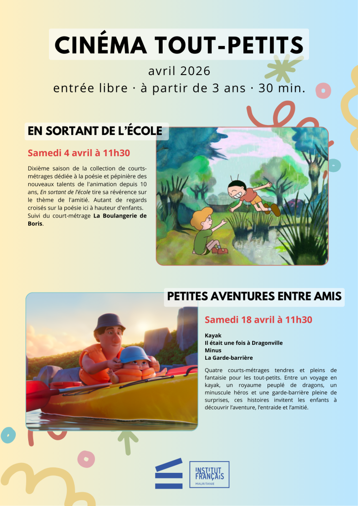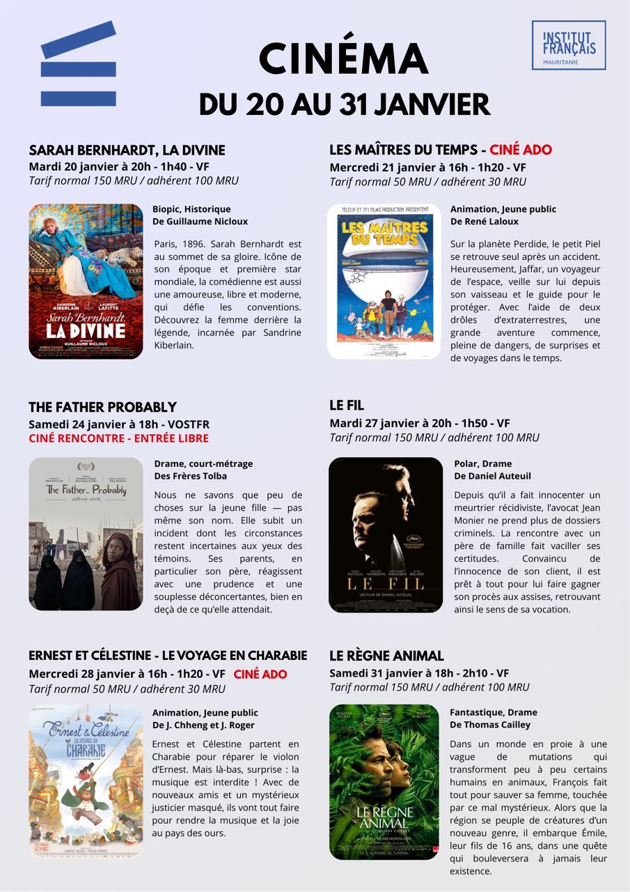 Danse, musique, théâtre, expositions, cinéma, conférences, débats d’idées, rencontres littéraires sont régulièrement présentées dans les différents espaces de l’Institut français de Mauritanie faisant de cet établissement un lieu de culture accessible, accueillant et ouvert à tous.